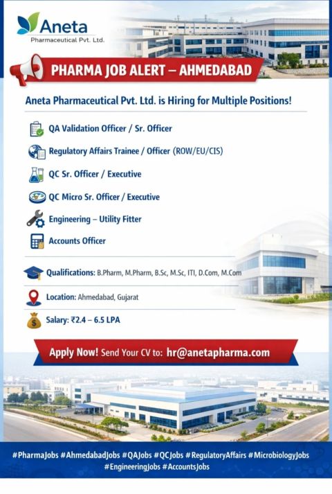 Aneta Pharmaceutical Pvt. Ltd. has announced new job openings in Ahmedabad for various positions across different departments. The company is seeking qualified candidates for roles in Quality Assurance (QA), Quality Control (QC), Regulatory Affairs, and Engineering. This recruitment drive aims to strengthen the team at Aneta Pharmaceutical with positions like QA Validation Officer, Regulatory Affairs Trainee/Officer, QC Executive, and Engineering Utility Fitter. Candidates interested in pharmaceutical sector jobs in Ahmedabad are encouraged to review the details and apply.