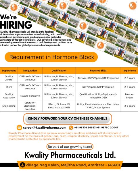 Kwality Pharmaceuticals Ltd. has announced job openings for various positions at their Amritsar facility. The company is seeking qualified candidates for roles in Quality Control (QC), Quality Assurance (QA), Micro, and Engineering departments, specifically for their Hormone Block requirement.