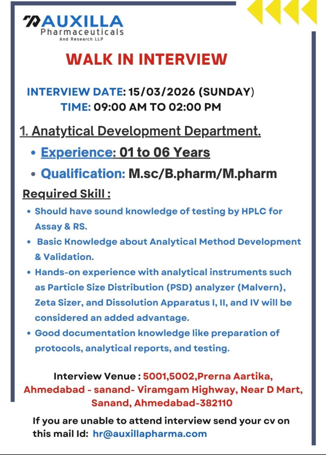 AUXILLA Pharmaceuticals is conducting a walk-in drive for experienced Analytical Development professionals in Ahmedabad. Eligible candidates with the required qualifications and skills in HPLC, method development, and instrumentation are encouraged to participate in the interview on March 15, 2026, or submit their CV via email for consideration.