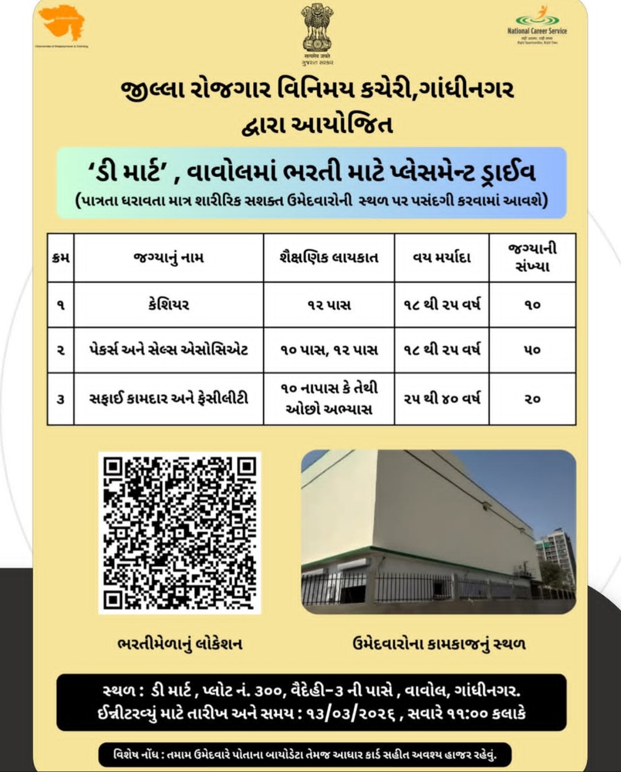 Interview Venue: D Mart, Plot No. 300, Near Vaidehi-3, Vavol, Gandhinagar (ડી માર્ટ, પ્લોટ નં. ૩૦૦, વૈદેહી-૩ ની પાસે, વાવોલ, ગાંધીનગર).