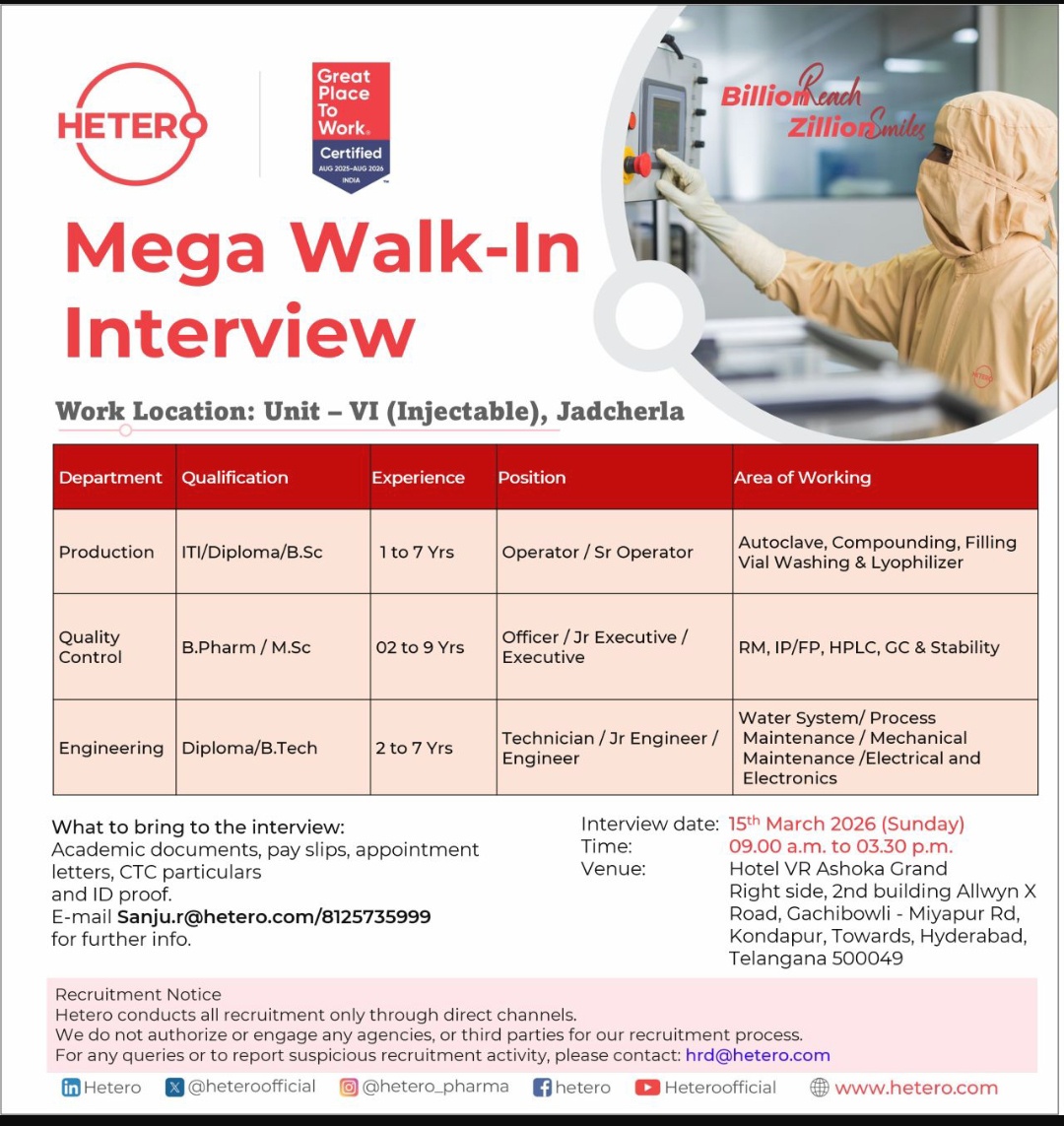 Hetero is conducting a Mega Walk-In Interview for its Injectable Unit (Unit – VI) located in Jadcherla. The company is seeking qualified and experienced professionals to join their Production, Quality Control, and Engineering departments. Interested candidates with relevant backgrounds in the pharmaceutical industry are invited to attend the interview process.