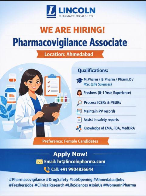 Lincoln Pharmaceuticals Ltd. has issued a recruitment notification for the position of Pharmacovigilance Associate. This opportunity is open to freshers and candidates with up to one year of experience looking to establish a career in the pharmacovigilance sector. The job opening is located in Ahmedabad.