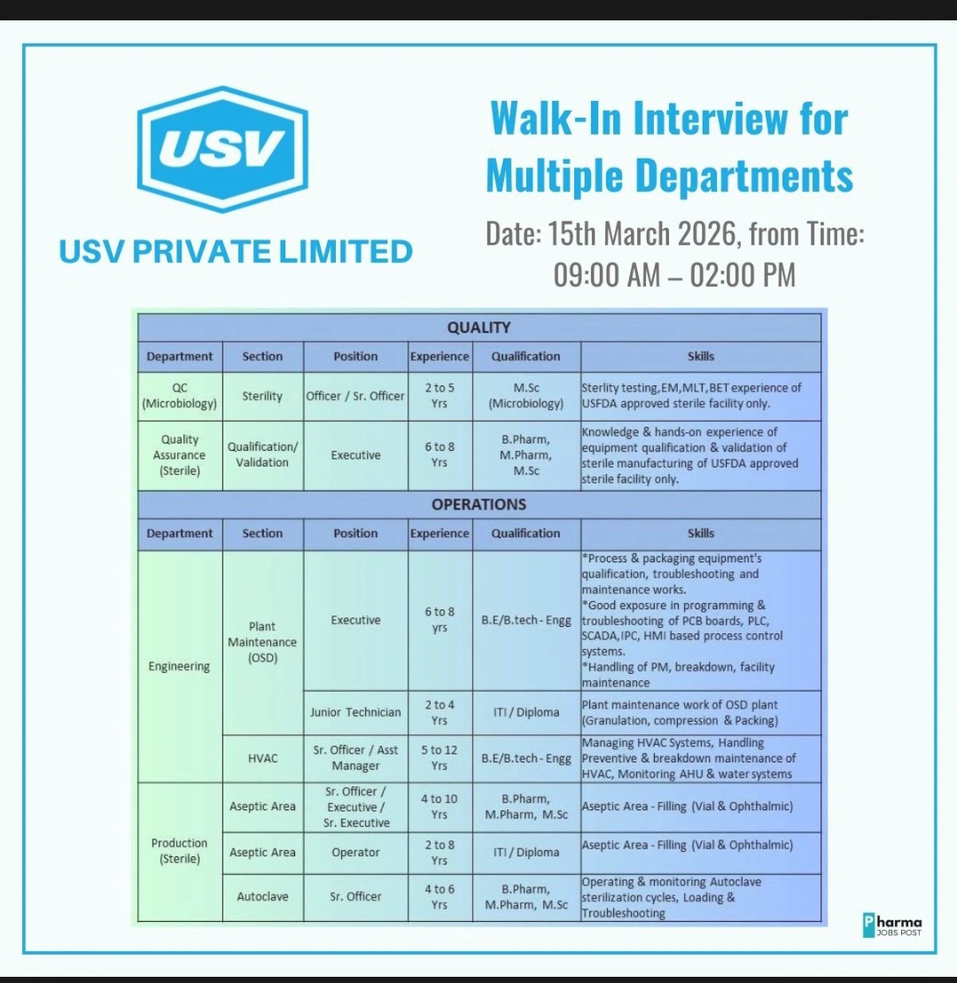This walk-in interview drive by USV PRIVATE LIMITED presents a significant opportunity for experienced professionals in the pharma sector to join their Quality, Engineering, and Production teams. Eligible candidates are advised to prepare their documents and attend the interview within the scheduled timings.