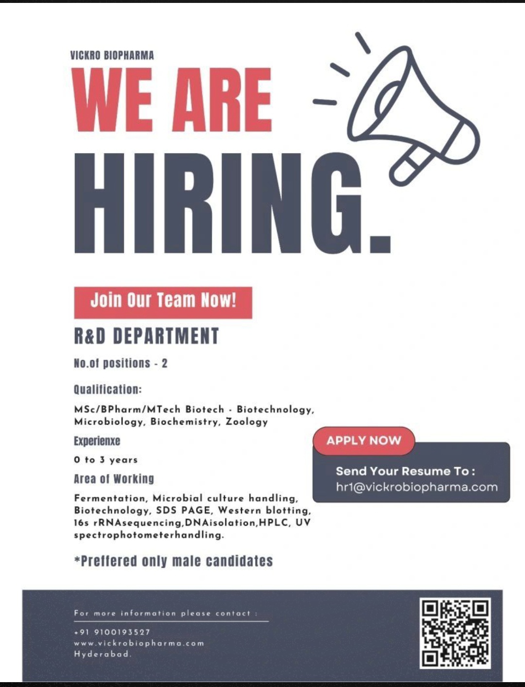 This recruitment drive by VICKRO BIOPHARMA presents an opportunity for early-career professionals in the field of biotechnology and life sciences to work in R&D in Hyderabad. Eligible candidates meeting the educational and skill requirements are encouraged to contact the company using the provided details.